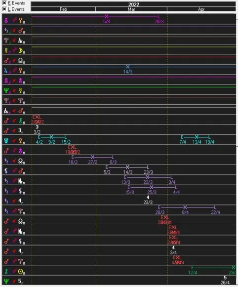 Es könnte noch ein gefährliches Aufbäumen im Sommer (Juli-August-September) geben, wenn Uranus Mondknoten auf Putins Jupiter und Schwarzer Mond über seinen Uranus Putin geneigt machen Massenvernichtungswaffen oder die Atombombe einzusetzen. Danach sollte seine Energie verpufft sein. Zeit für einen "Regimewechsel". UPS. Ist ja nur meine unmaßgebliche Meinung auf grund der Konstellationen.