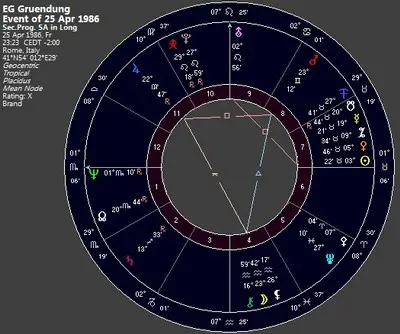 Astrologisch gesehen ist im Gründungshoroskop der europäischen Gemeinschaft eines besonders deutlich zu erkennen: Technikfixiertheit! Aufsteigender Mondknoten in Skorpion bedeutet, dass man alte traditionelle Agrargesellschaften (Gegenzeichen Stier) hinter sich lässt. Sozusagen mit aller Gewalt ohne Erkennen von Folgen (Neptun steht beim aufsteigenden Mondknoten) arbeitet man am technischen Fortschritt. Genau dies wird symbolisiert durch Herrscher Pluto zehnten Haus, der in Konjunktion mit Zeus das angestrebte Ziel markiert. Pluto steht für die Gewalten, die man bereit war zu mobilisieren. Darunter auch die Kernenergie. Die markante Stellung von Pluto und Zeus zeigt, dass es (der Politik!) beinahe einzig und allein darum ging, technische Fortschritte zu generieren und voranzutreiben. Der Wendepunkt konnte eintreten, als der sekundär progressive MC endlich diese Pluto/Zeus-Kombination transitierte: Fukushima.