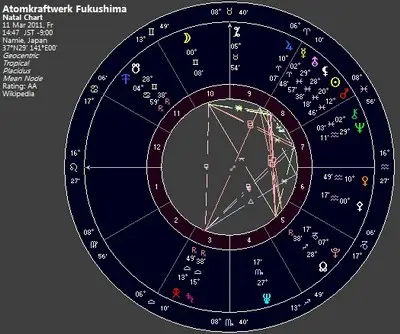 Das Ereignis von Fukushima ereignete sich erst, als Pluto mit Zeus ins neunte Haus der Europäischen Gemeinschaft gewandert war (sekundär progressiv). Daher konnte ein Ereignis mit Atomkraft und Kernenergie also dieses Mal in Übersee stattfinden.