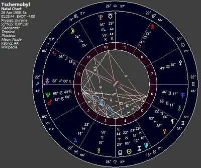 Wie den Nagel auf den Kopf trifft daher, dass exakt zum Unfall von Tschernobyl der Neptun am Aszendenten der europäischen Gemeinschaft stand. Er symbolisiert genau dieses, nämlich die Unfähigkeit, die Problematik richtig wahrzunehmen. Radioaktivität lässt sich nun mal nicht riechen, schmecken oder fühlen. Man ist also betäubt, ist Opfer von Kräften, die man losgelassen hat und nicht mehr bändigen konnte, man wurde und wird die sprichwörtlich aufgerufenen Geister nicht mehr los. Nichtsdestotrotz, aufgrund der Medienberichterstattungen wurde jedem Bürger im hintersten Winkel des Landes vermittelt, dass eine, und zwar nicht nur latente, sondern äußerst reale Gefahr besteht. Mit dem Übergang des Aszendenten über den Neptun verschwand gleichzeitig mit der Erkenntnis von Tschernobyl auch die Fähigkeit, sich gegenüber den möglichen Modernisierungsrisiken zum Beispiel durch Atomkraftwerke, gänzlich blind und taub zu stellen. Es war sozusagen die Vertreibung aus dem Paradies der Technikgläubigkeit.